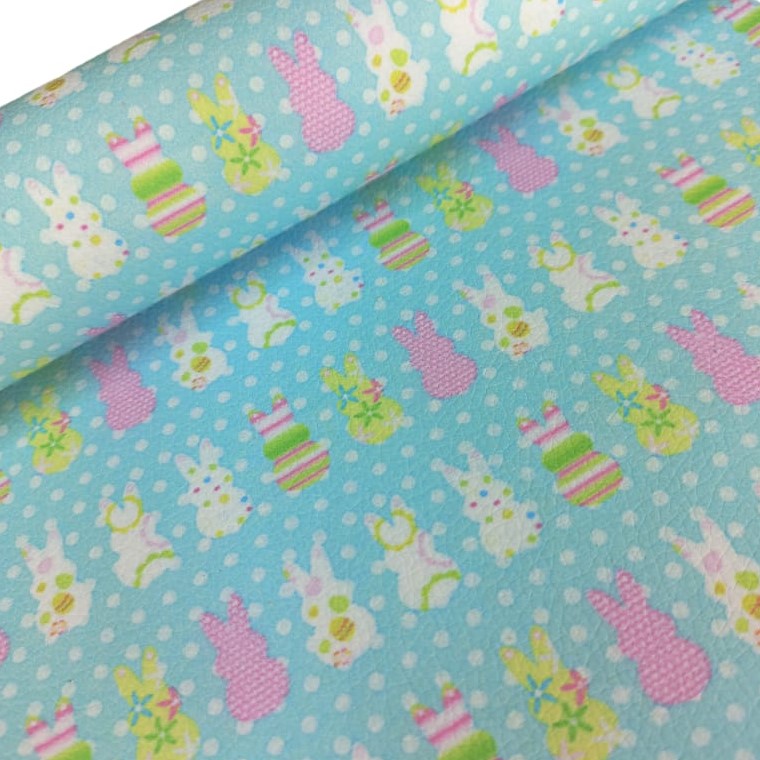 A 20 x 33cm sheet of Easter Litchi Grain faux/synthetic leather with a cute “Peeps” Easter Bunny design.