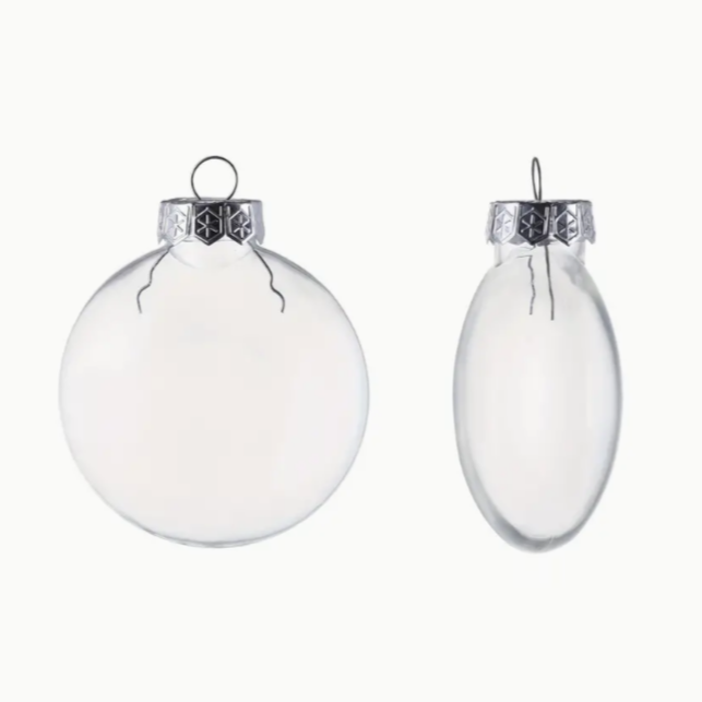 A transparent, plastic Christmas bauble with removable lid. 8cm in diameter.