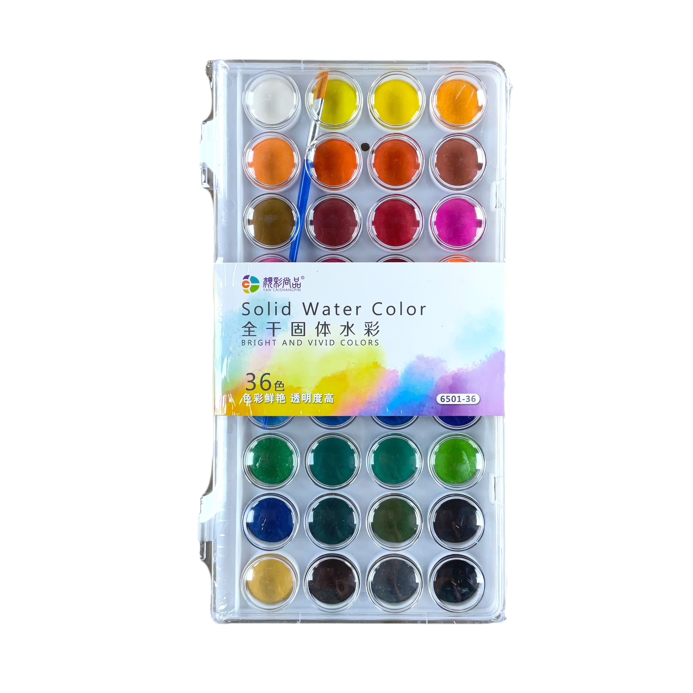 A palette of 36 solid water colour paints. Includes a flat tip paintbrush.